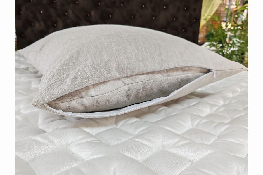 • Чехол выполнен из натурального льна с добавлением хлопка — эта комбинация даёт приятную на ощупь, дышащую поверхность, способную мягко адаптироваться к температуре тела. Лён регулирует тепло и впитывает влагу, а хлопок добавляет нежности и комфорта.