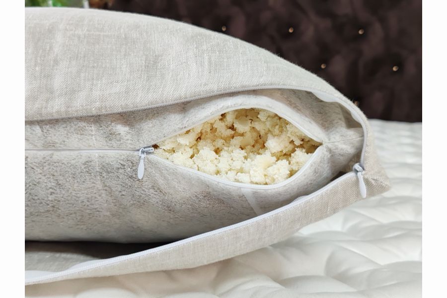 • Наполнитель — измельчённый 100% природный латекс из сока гевеи. Он упругий, воздушный, гигиеничный. Такой латекс не теряет форму, не скатывается и обеспечивает мягкую, но стабильную поддержку шеи и головы во время сна.